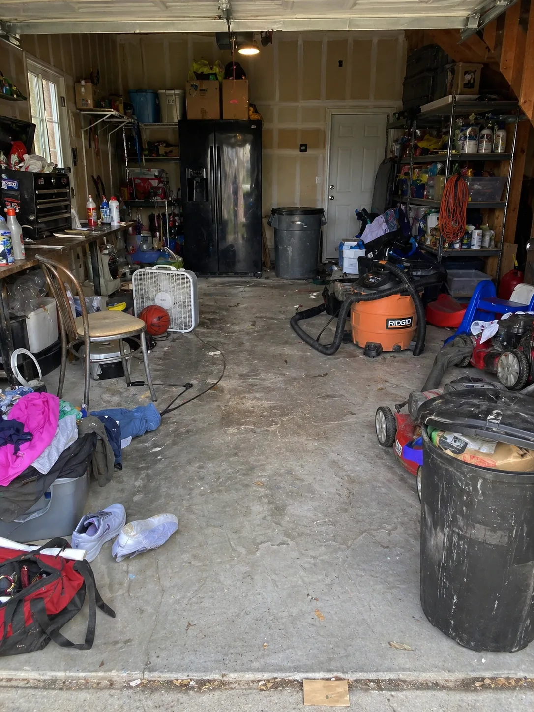 High PriorityProblem. I see a lawnmower, a shop vac, and what looks like other yard equipment just sitting on the floor, spilling out around the trash can. This takes up valuable floor space, creates obstacles, and indicates these items don't have a designated parking spot.
