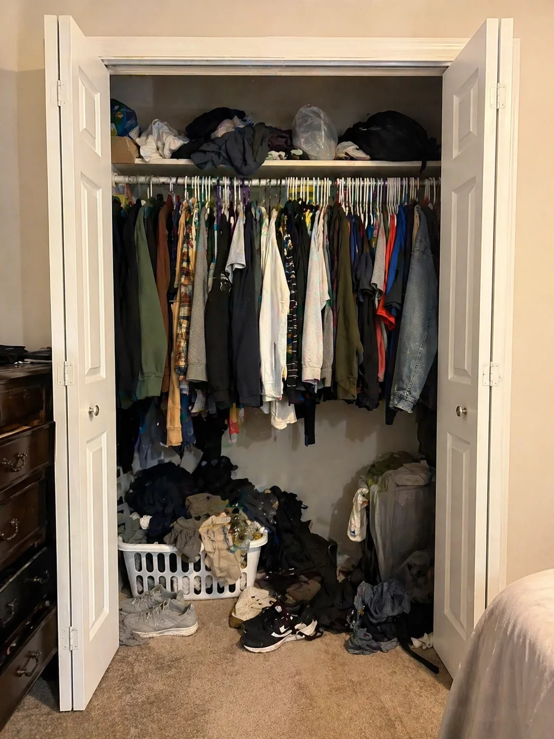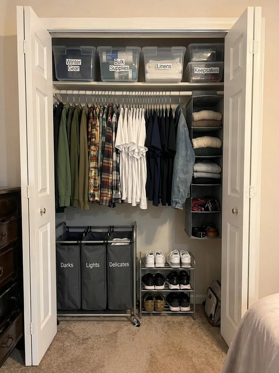 Most reach-in closets have one hanging rod and a high shelf. Adding a second rod (instant double-hang) or a hanging organizer doubles your hanging capacity for under $50.