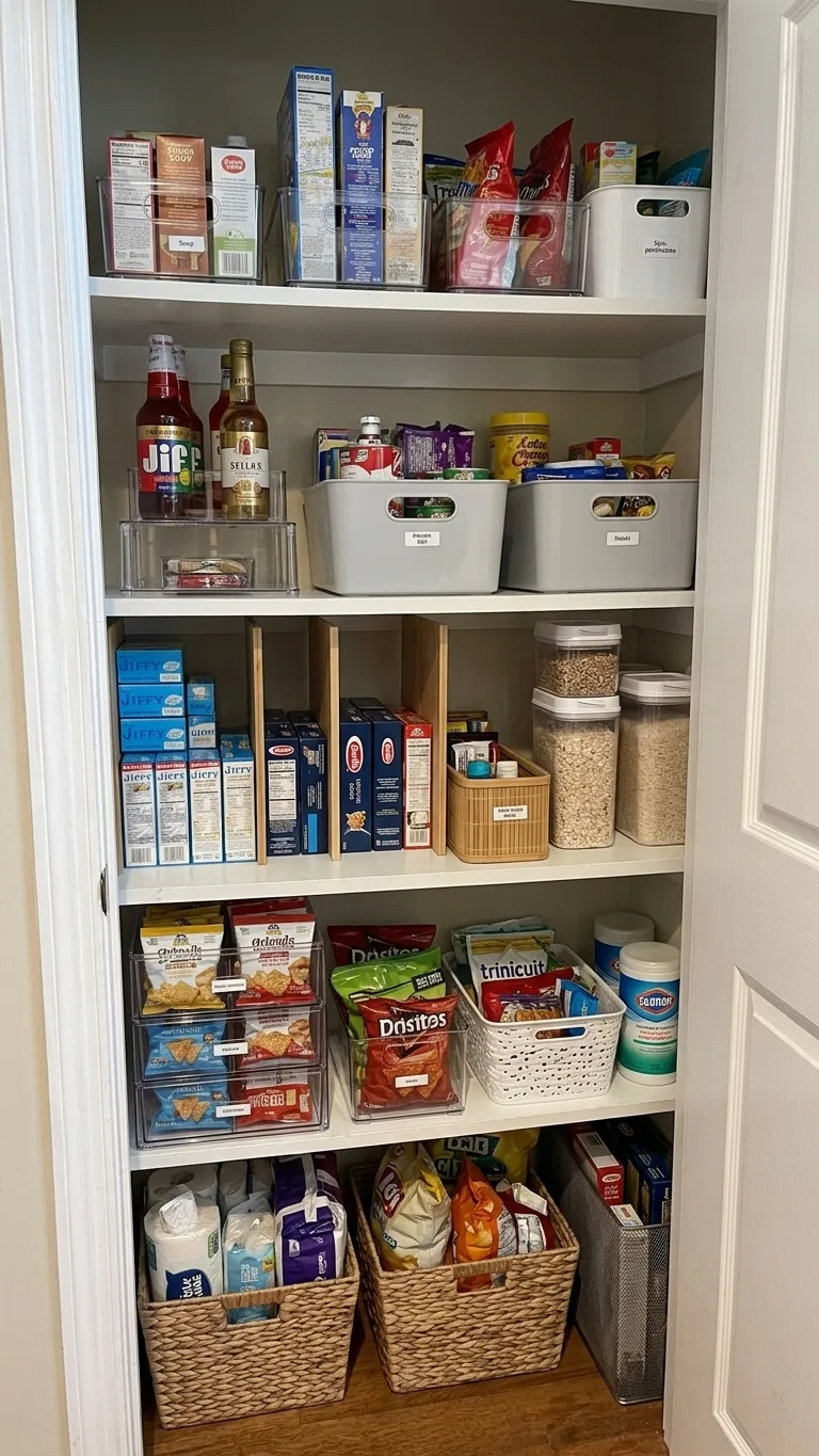 Without designated zones (baking, breakfast, snacks, kid-reachable), the pantry resorts itself to chaos within two weeks. Bins with labels are the enforcement mechanism.