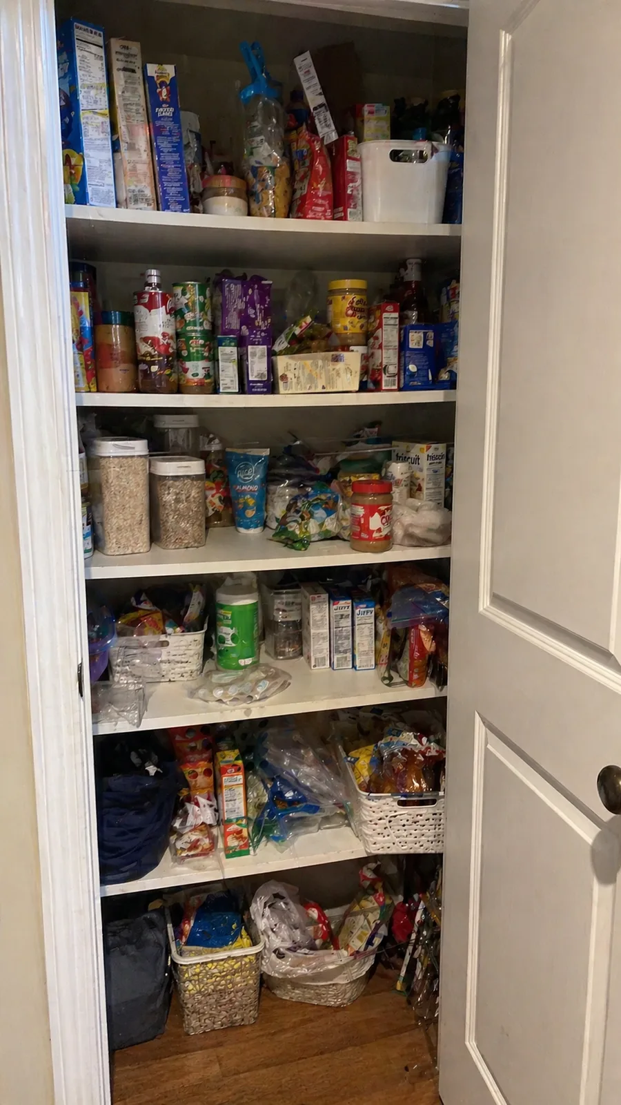 Loose snack bags, opened cereals, half-finished pastas — they collapse and bury whatever was behind them. Square clear bins or labeled airtight containers solve this in one shopping trip.